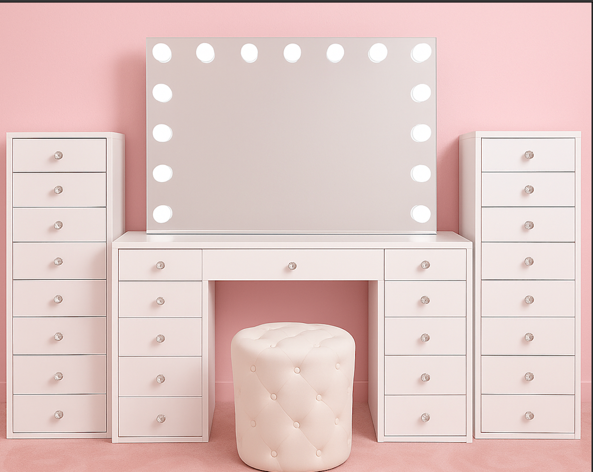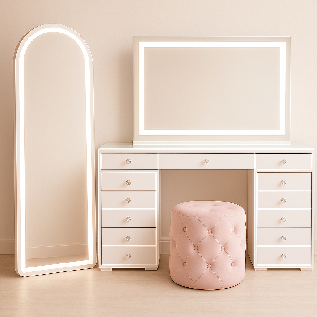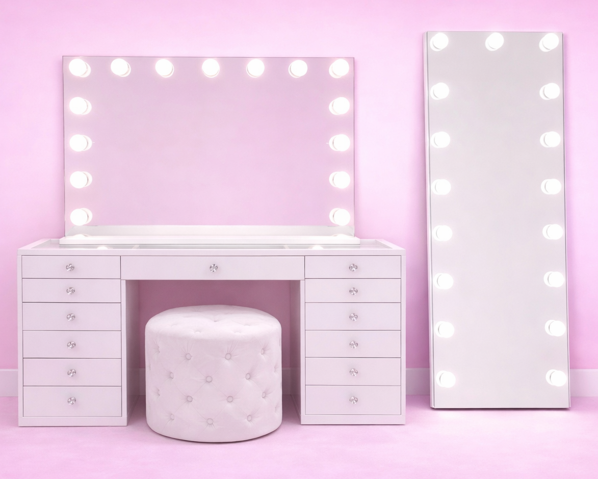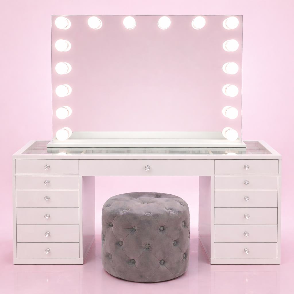 Whether you are just planning your glam room or want to change your current setup, Vanity Vault gets you covered. We provide a complete Vanity Vault Essentials Package that comprises a tasteful vanity table, a stylish mirror, and a beautiful ottoman. Get more makeup vanity tables here and give your home the luxurious touch it deserves. From the Classic Vanity Desk to the Luna Luxe Mirror, our premium offerings are designed to assist you in creating an ideal beauty space. Design your ideal room today and indulge in luxury daily!