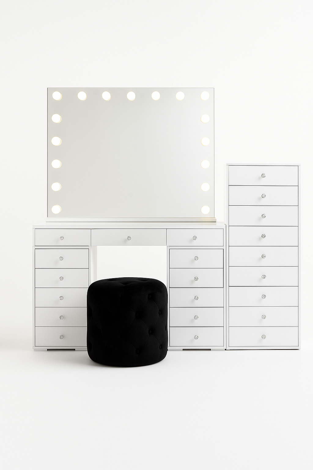 Picture yourself seated at your makeup vanity table, carrying everything you need to attain your dream look. Beautify your home with fabulous options, including the Anastasia Collection, which encompasses the Classic Vanity Desk, the Harmony 9-Drawer Tallboys, and the opulent Ivory Luxe Ottoman.