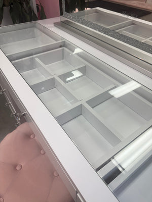 Turn heads with the sleek, semi-gloss Dollface Vanity – the newest star in the Vanity Vault lineup. Designed with a flush glass top, secure structure, and soft-close drawers finished with sparkling crystal knobs. The top centre drawer includes built-in dividers to keep your glam essentials perfectly organised.