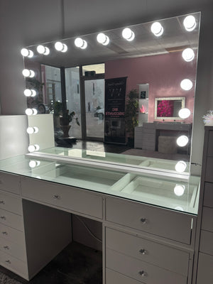 The Aurora Dream Mirror is a true statement piece, designed for those who want their beauty setup to feel polished, elevated, and effortlessly luxe. With its generous size, sleek silhouette, and flawless LED lighting, this mirror instantly transforms your space into a glamorous personal sanctuary.