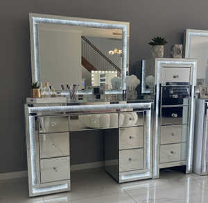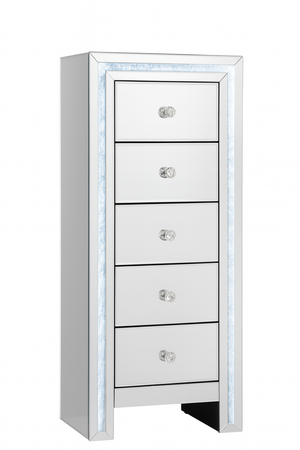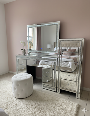 With six mirrored drawers, each finished with crystal knobs, the tallboy offers the perfect blend of storage and style. Its sleek mirrored surfaces reflect light effortlessly, while the built-in LED trim adds that signature snow-kissed shimmer the collection is known for.