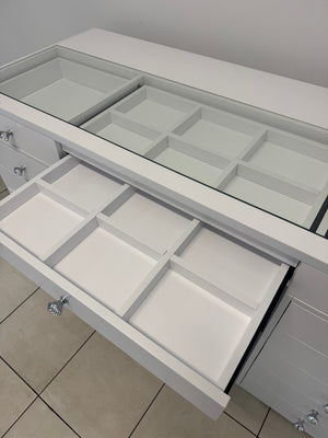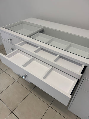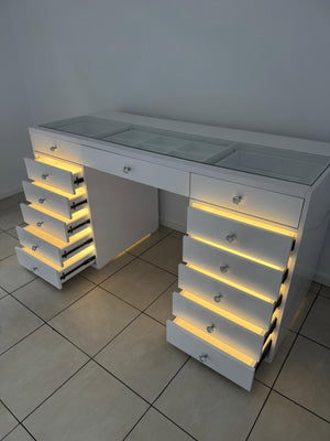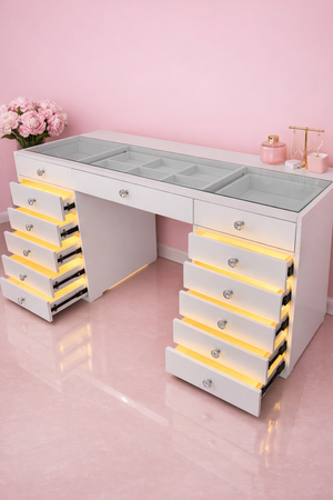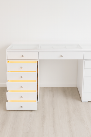 LED Lit Drawers: Soft, built in LED lights make finding your products effortless, even during late night glam sessions.