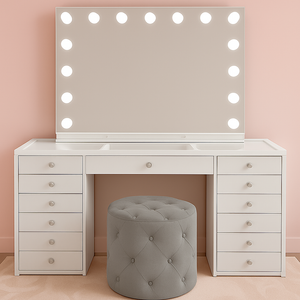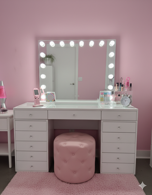 • 1x Marshmallow Ottoman – Your choice of Pink, Black, Grey, or White, crafted for comfort and style, making the perfect finishing touch to your vanity setup. * PLEASE NOTE THE WHITE OTTOMANS ARE ON PRE ORDER AND WILL BE SENT OUT AS SOON AS THEY ARE BACK IN STOCK. ETA END OF OCT SUBJECT TO DELAYS